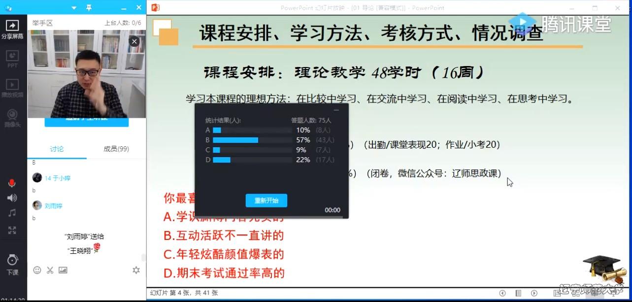 完备的教学计划和准备工作是顺利开展网络授课的前提和基础,教学中所谓的“没有做不到、做不好的学生;只有规范不严谨、要求不到位的老师”。为了保证课堂教学效果,参与了包括雨课堂、超星学习通、腾讯视频会议等相关培训,并进行相关调试,针对不同专业学生的特点提出严格、细致、灵活的具体要求;首先,在手机微信或QQ建群,发布相关通知和规范要求;其次,在超星学习通中建课、建班级、指引学生扫码进群 ,并将相关资源导入学习通中,引导学生利用平台资源积极参与课堂研讨学习;再次,要求学生准备课堂听课笔记,并指导课堂笔记记录规范和相关要求;最后,通过辽师思政课微信平台的复习资源进行自主总结复习。