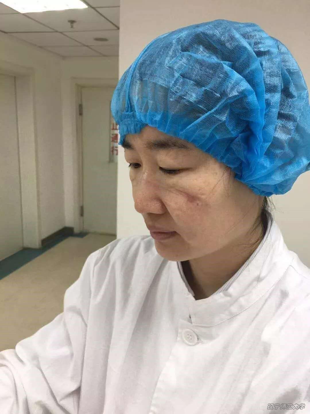 (图片来源:大连市六院抗疫一线医生,我的学生在六院工作,她发来的。她说,摘下N95口罩后的压痕,大家需要涂药膏来缓解)