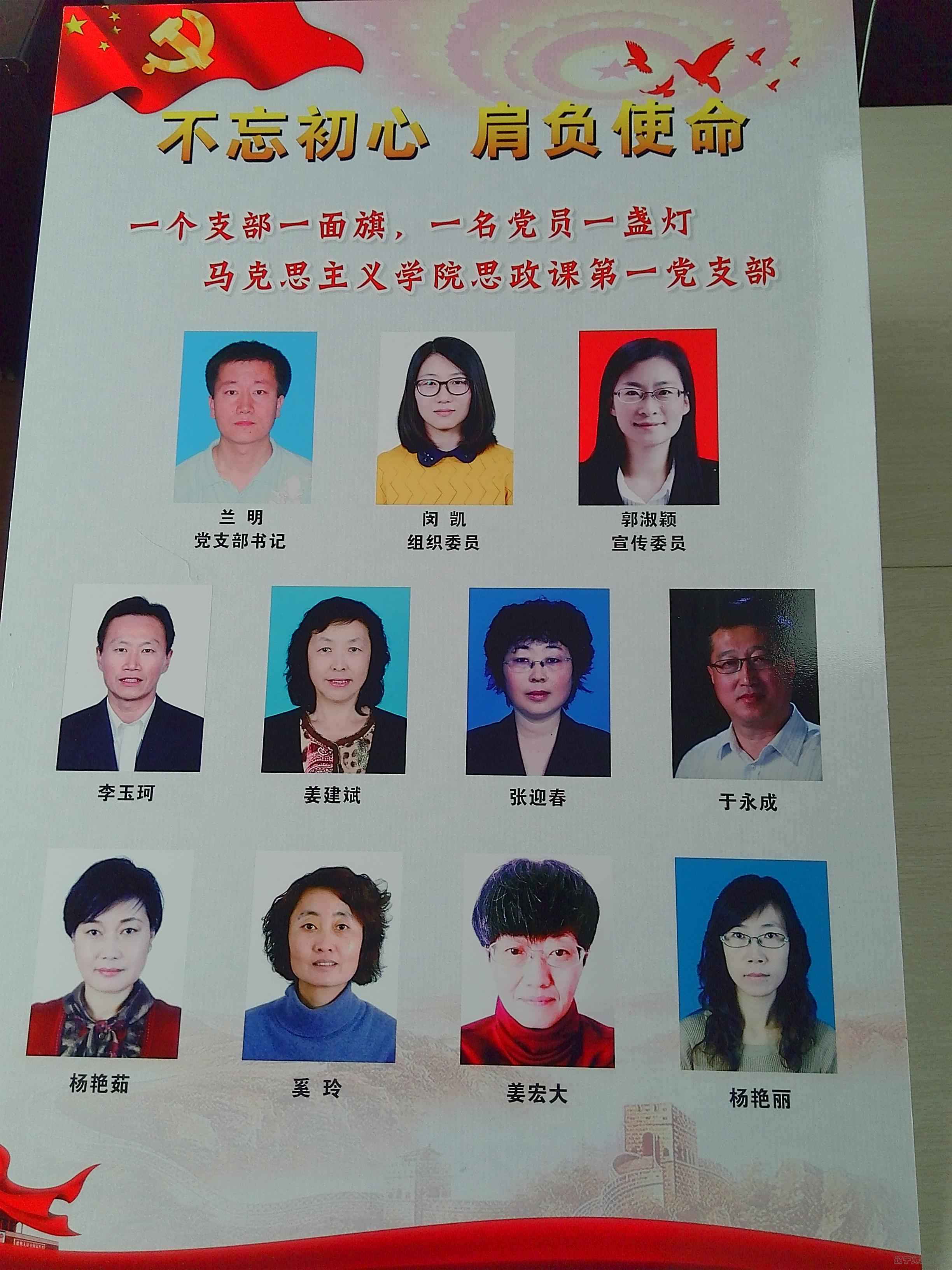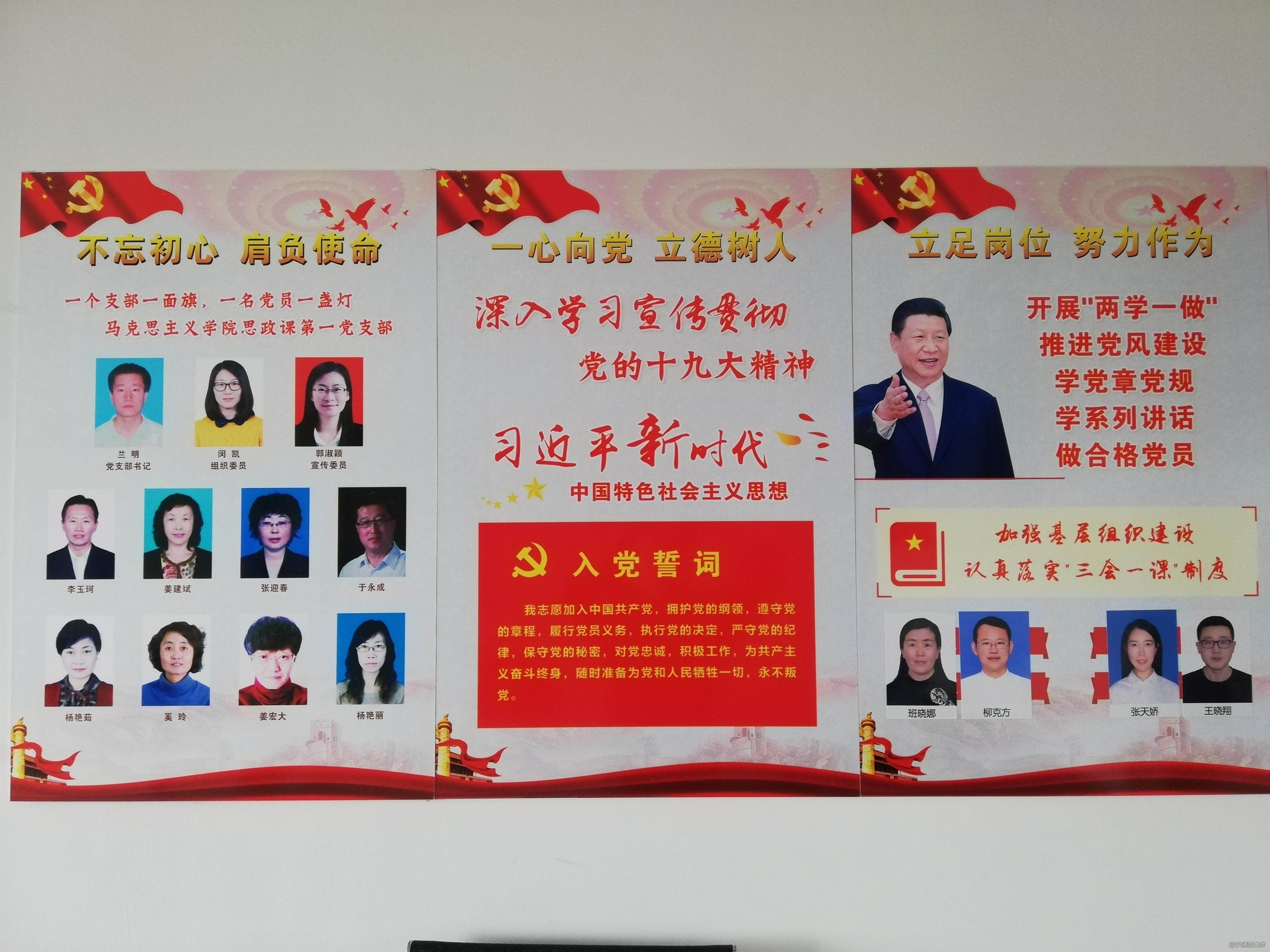 马克思主义学院思政课第一党支部是学院人数最多的教师党支部,共有教师党员15人,由马克思主义基本原理教研室与思想道德修养与法律基础教研室教师组成。党支部活动室在马克思主义基本原理教研室1713。支部委员会由支部书记、组织委员、宣传委员、纪检委员4人组成。支部设有共产党员先锋岗、共产党员学习资料专柜、党支部组成人员、“三会一课”制度展板以及学习宣传习近平新时代中国特色社会主义思想和十九大精神宣传栏。