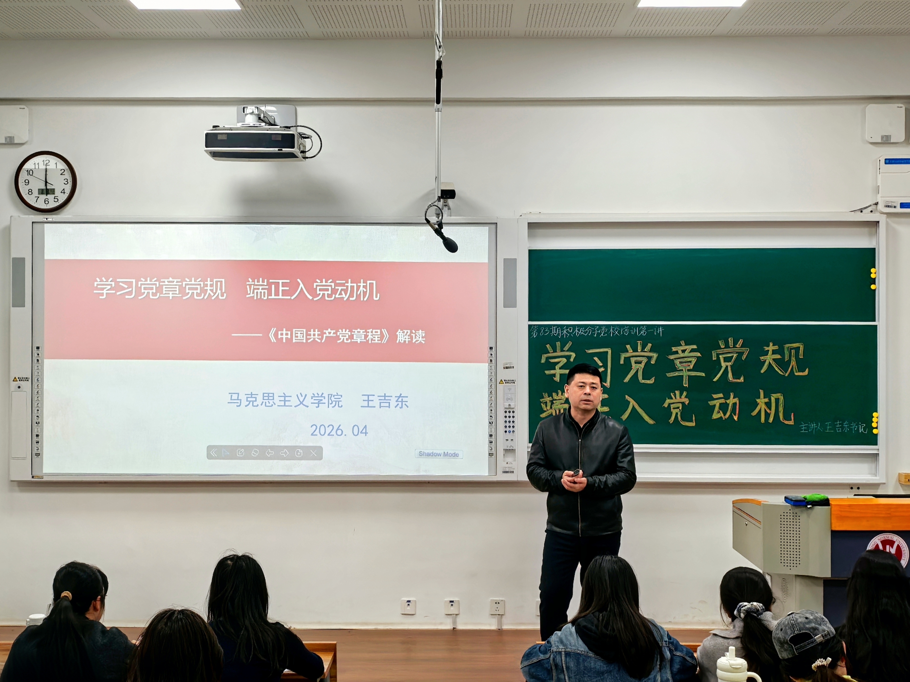 2026年4月7日晚,马克思主义学院第83期党校培训第一讲于实训楼310教室开课,学院党委书记王吉东老师对《中国共产党章程》进行解读。马克思主义学院研究生、本科生入党积极分子参加培训。