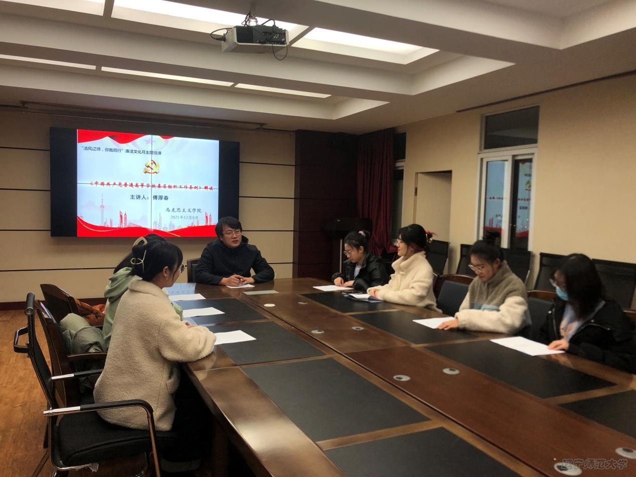 为深入开展辽宁师范大学第一届“清风辽师·你我同行”廉洁文化月活动,我院党委副书记傅厚春老师12月8日下午在文科一号楼8楼会议室为学生党员和46期发展对象党做《中国共产党普通高等学校基层组织工作条例》解读。