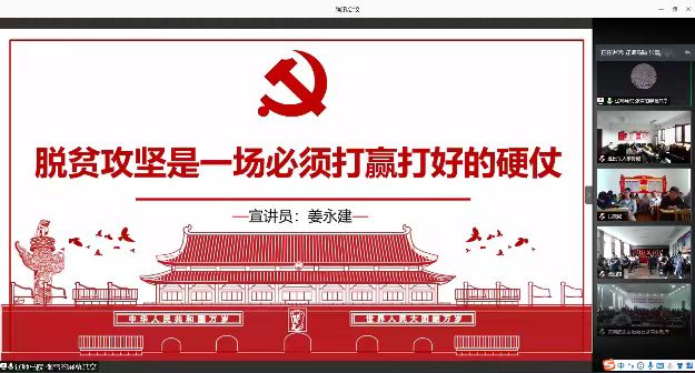 为助力全面建成小康社会目标实现,深入学习贯彻习近平新时代中国特色社会主义思想,马克思主义学院师生理论宣讲团于2020年9月17日14:00利用“腾讯会议”APP面向丹东市宽甸县基层党员干部、大连市住房公积金管理中心长兴岛(瓦房店)办事处、中国建设银行大连瓦房店支行进行云端宣讲。本次宣讲团的主讲嘉宾姜永建老师以及2018级本科生张雪、王晓春、姚依杭三名宣讲成员,围绕打赢脱贫攻坚战这一主题宣讲,丹东市宽甸县基层、大连市住房公积金管理中心长兴岛(瓦房店)办事处、建设银行大连瓦房店支行等三百多人在线参加学习。