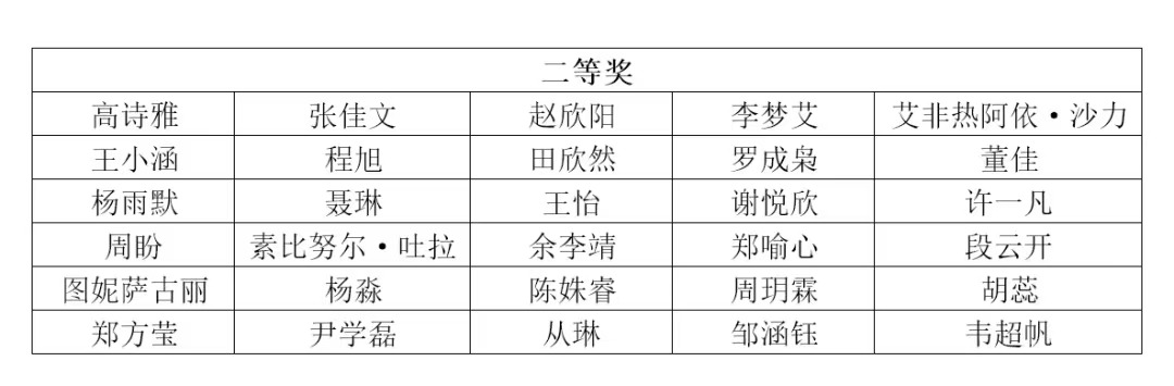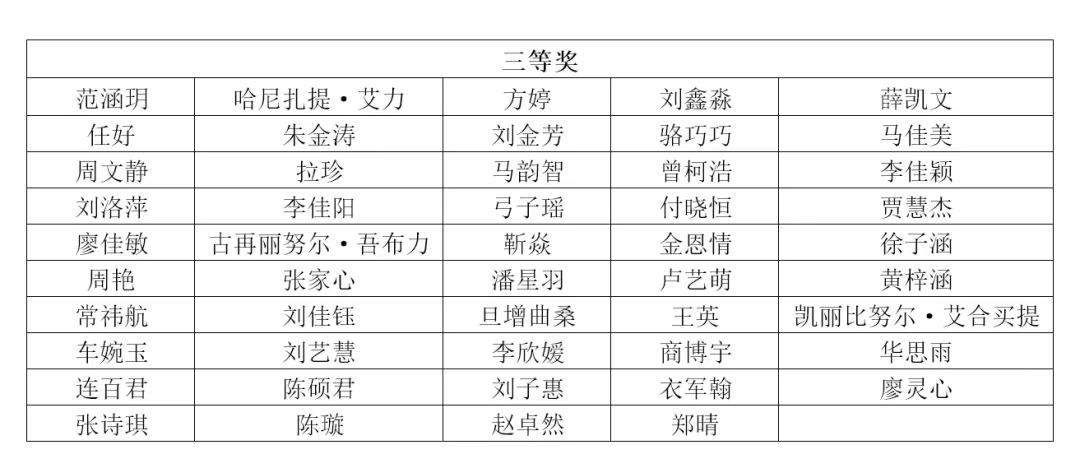 研究生:一等奖:高一白、二等奖:刘畅:王梓先、于昕言,三等奖:张潆艺、王科捷、王羽秀、刘雅欣,优秀奖:王言、蓝宇琦、杨乔为、赵黎。