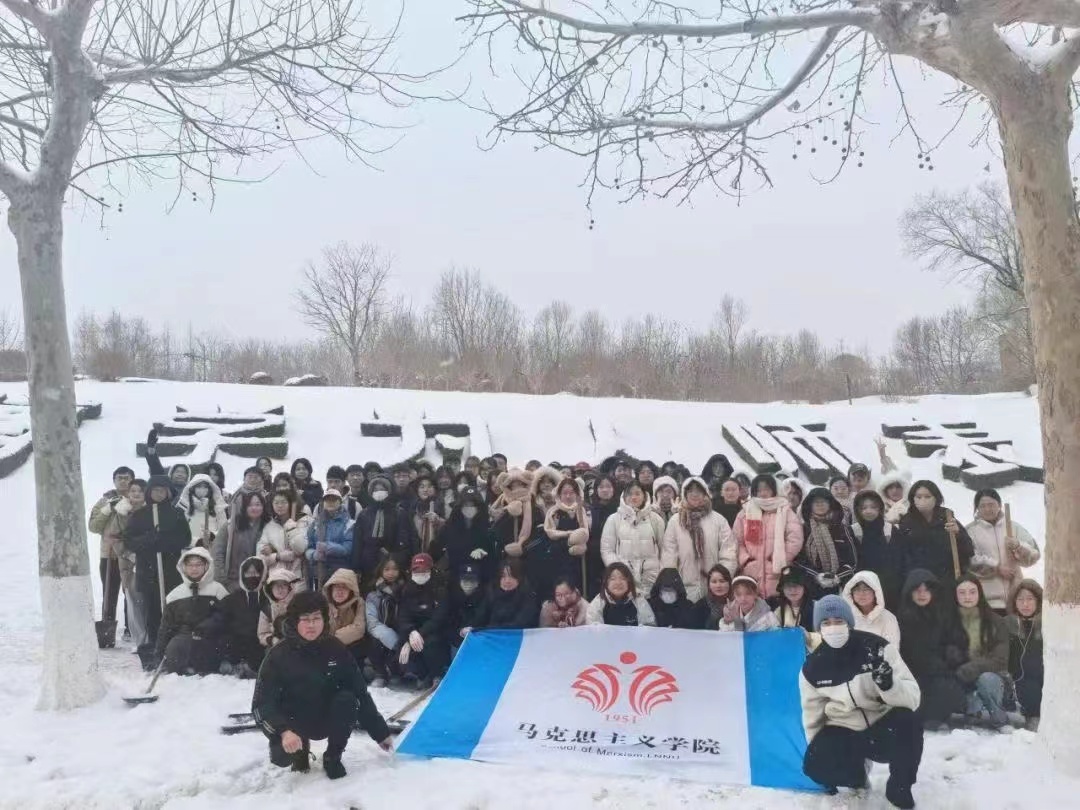 在实训楼旁,马院学子们有条不紊地进行着志愿扫雪活动。他们挥舞着铲子,不畏严寒,扫去道路上的积雪,铺就了一条条安全便捷的通行道路。