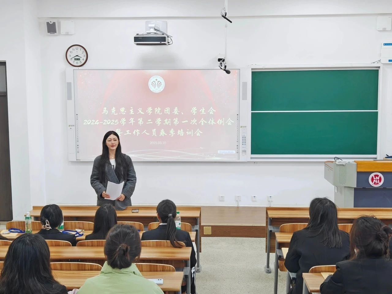 为进一步提高我院团委、学生会成员的工作能力,促进团委、学生会各部门间的沟通与合作,更好地开展新学期的工作,2025年3月10日15时我院于实训楼313教室召开团委、学生会2024-2025学年第二学期第一次全体例会。出席本次会议的有马克思主义学院团委书记曾环老师以及马克思主义学院2022级、2023级团委、学生会全体成员。本次会议由2022级本科生黄靖蕾主持。